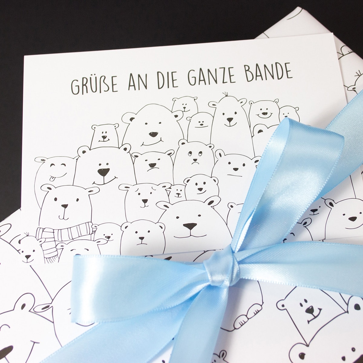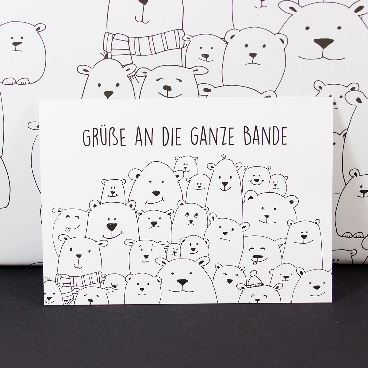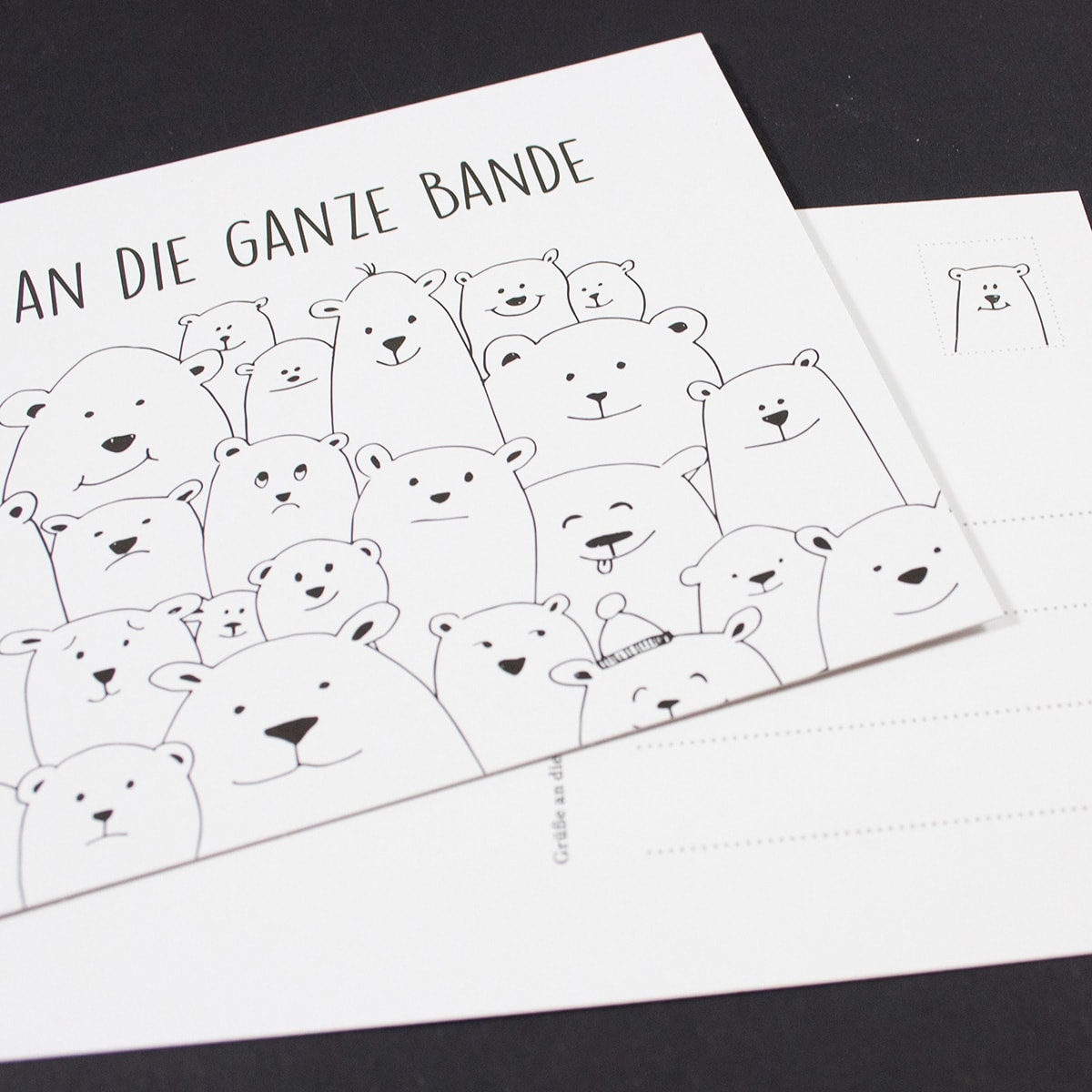 Eine fröhliche Postkarte aus reinem, seidigem Recyclingpapier in guter Qualität (350g). Eignet sich wunderbar zum Einrahmen, Verschenken oder Verschicken. Auf der Rückseite hat die Briefmarke Platz in einer kleinen Grafik als Platzhalter, ein Adressfeld ist auch aufgedruckt. Viel Freude mit der Eisbärenbande!