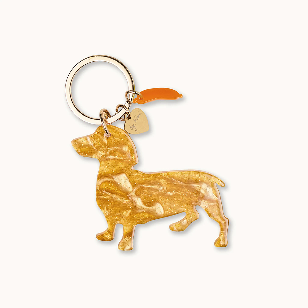 By Vivi. Schlüsselanhänger “Dackel Herbert”. Die stilvollen Schlüsselanhänger von ByVivi sind mehr als nur praktische Begleiter – sie setzen ein modisches Statement! Gefertigt aus hochwertigem Celluloseacetat, überzeugen sie nicht nur durch ihre Langlebigkeit, sondern auch durch ihre besondere Optik. Die einzigartigen Designs, von verspielt bis elegant, machen sie zu einem echten Hingucker an deinem Schlüsselbund, deiner Tasche oder deinem Rucksack.