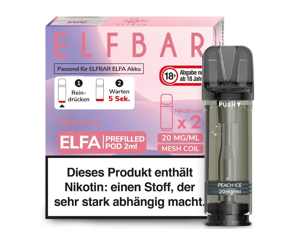 Der Elfbar ELFA Pod Peach Ice ist passgenau für den Elfbar ELFA Akku und ausschließlich für ihn konzipiert. Alle Pods sind mit 2ml Nikotinsalzliquid vorbefüllt. Ihre Nikotinstärke beträgt 20mg/ml.