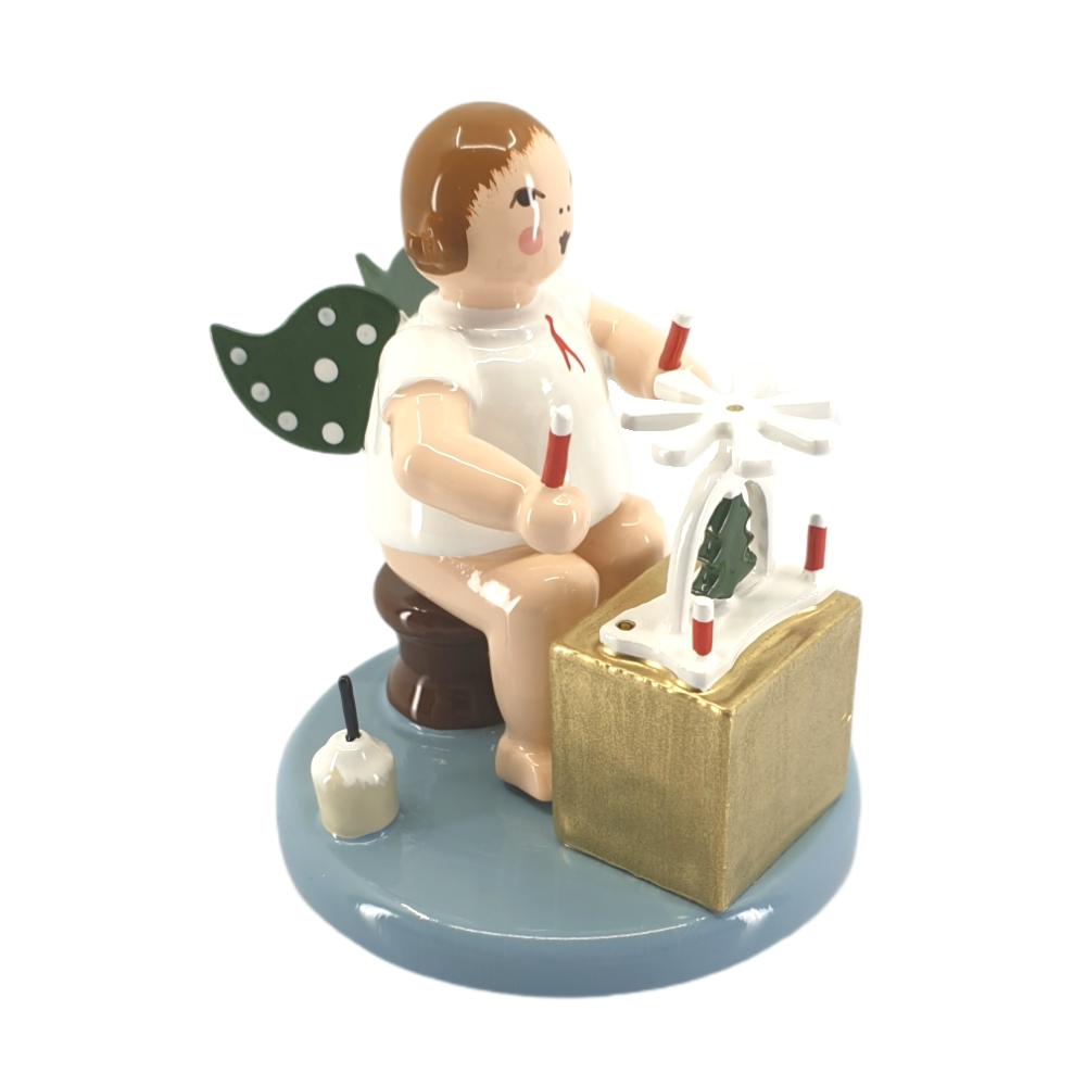 Dieser Engel mit Pyramide, sitzend, ohne Krone präsentiert seine Pyramide und sorgt so für strahlende Gesichter und guter Stimmung.