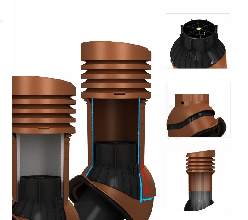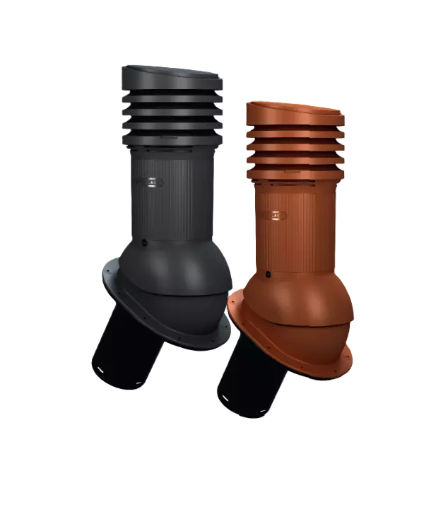 Kompleter Dachlüfter mit Profildachdurchführung ist für die Montage direkt auf Dachsteinen bestimmt. Spezielle ablaufkanäle führen den Kondensat auf die Dachziegeln ab. Das Produkt besitzt eine eingebaute Wasserwaage, die Montage einfacher macht. Dank der Click Montage wird die Haube auf der Dachdurchführung stabil und sicher montiert.