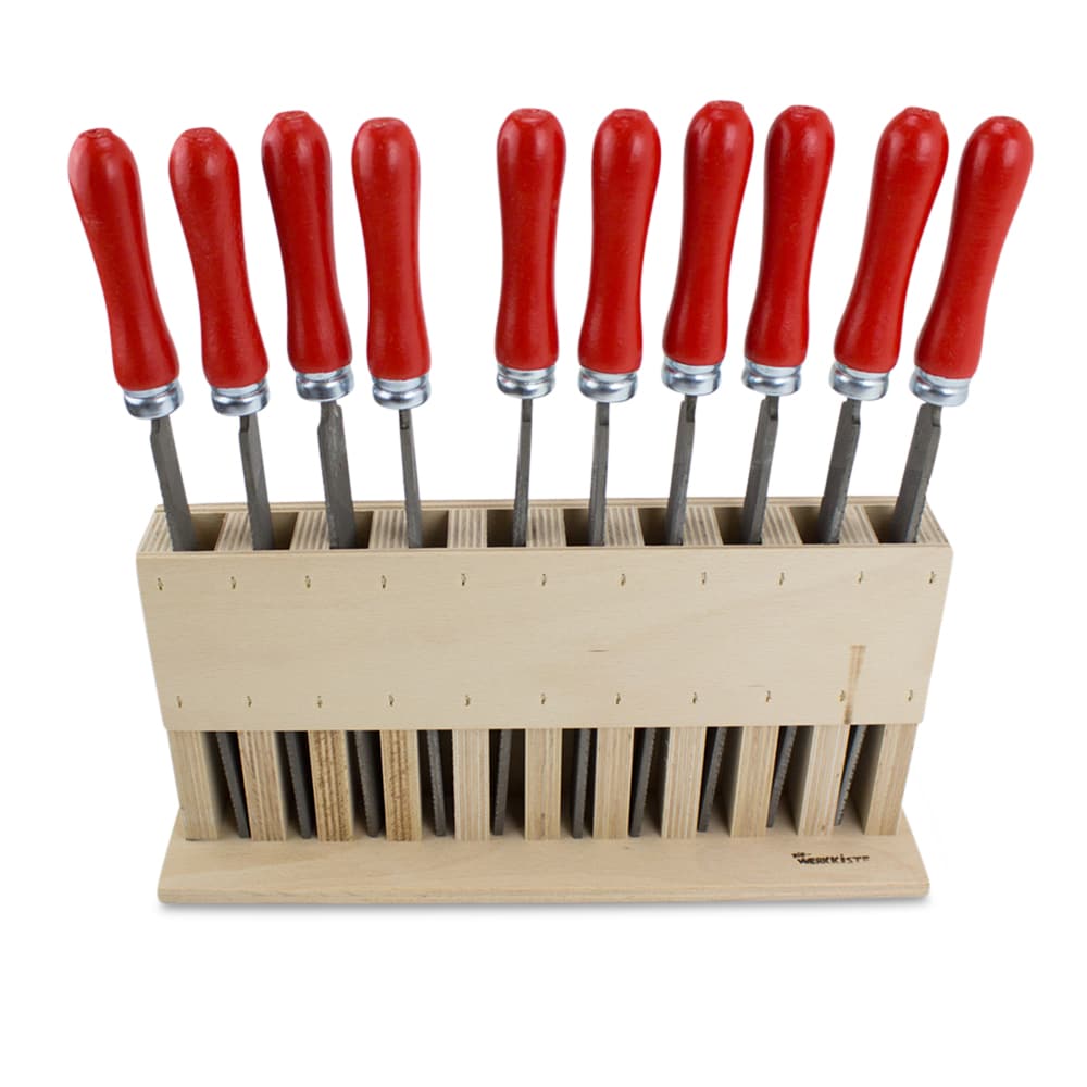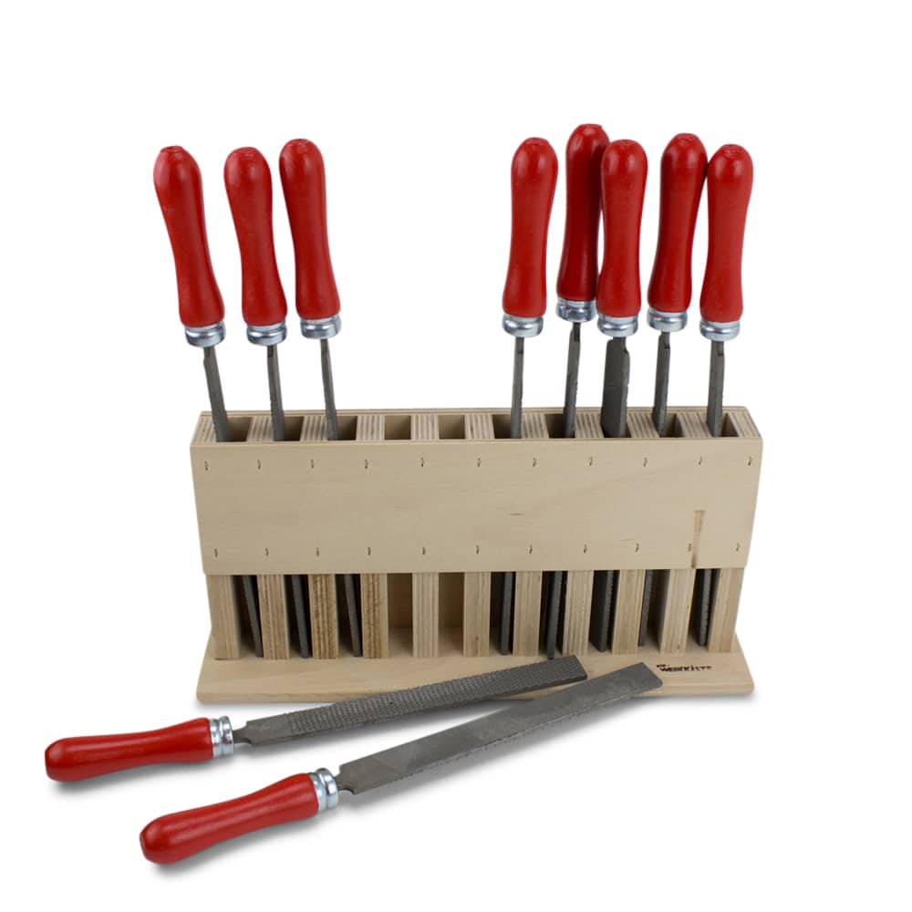 10 Feilraspeln in der praktischen Aufbewahrung, für mehr Übersicht im Schrank und auf dem Tisch.