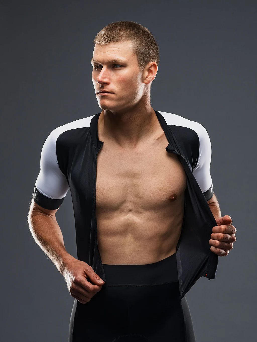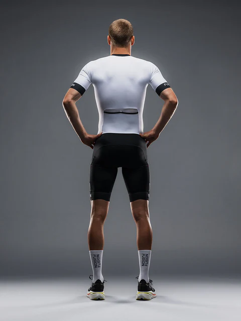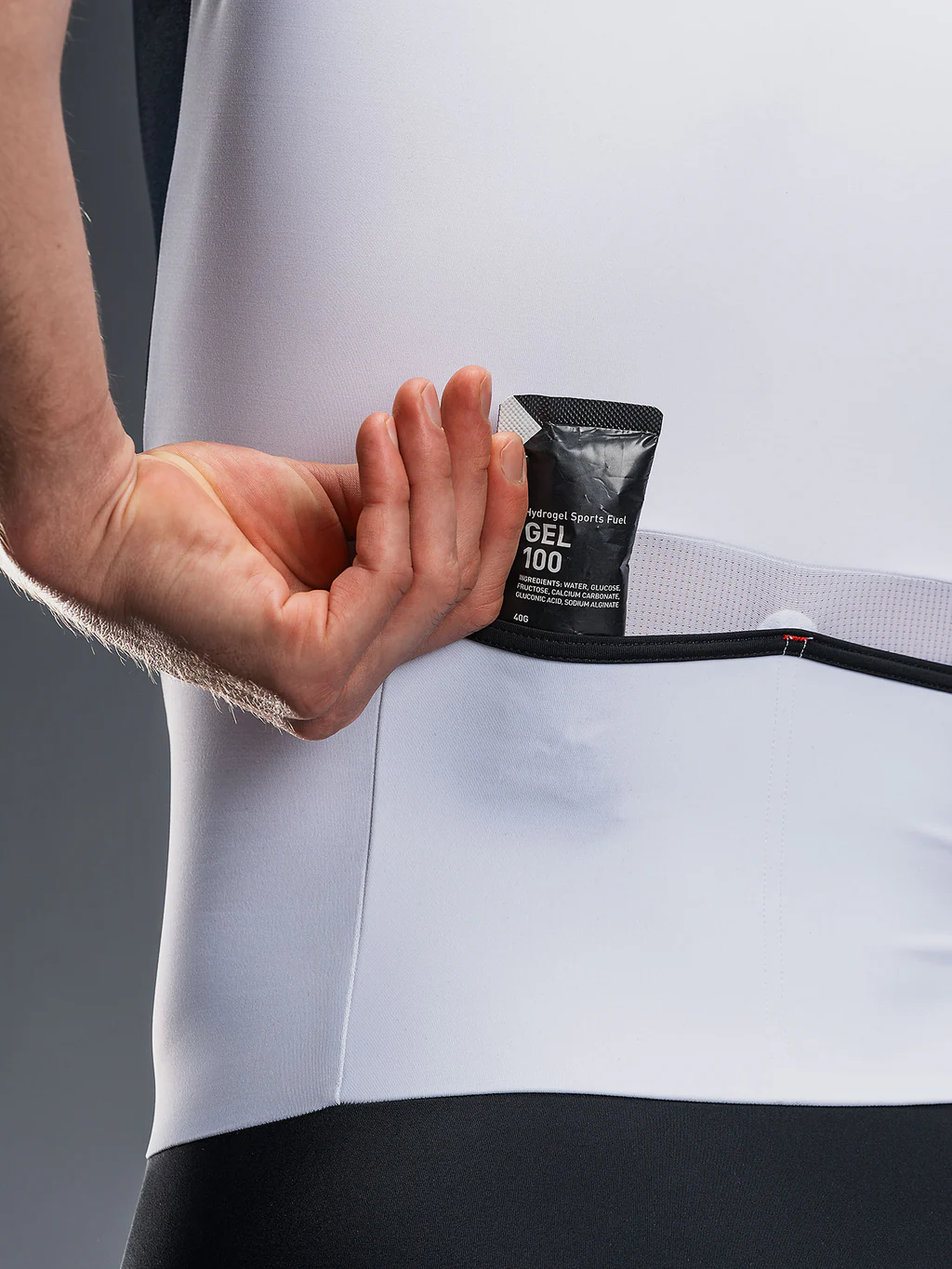 Aerodynamische und ernährungsphysiologisch zugängliche Taschen bieten praktische Unterstützung, ohne die Leistung zu beeinträchtigen. Hergestellt aus elastischen, komprimierenden Materialien sorgen für eine gute Passform, mit frei geschnittenen Bändern, die eine perfekte Körperkontur gewährleisten.