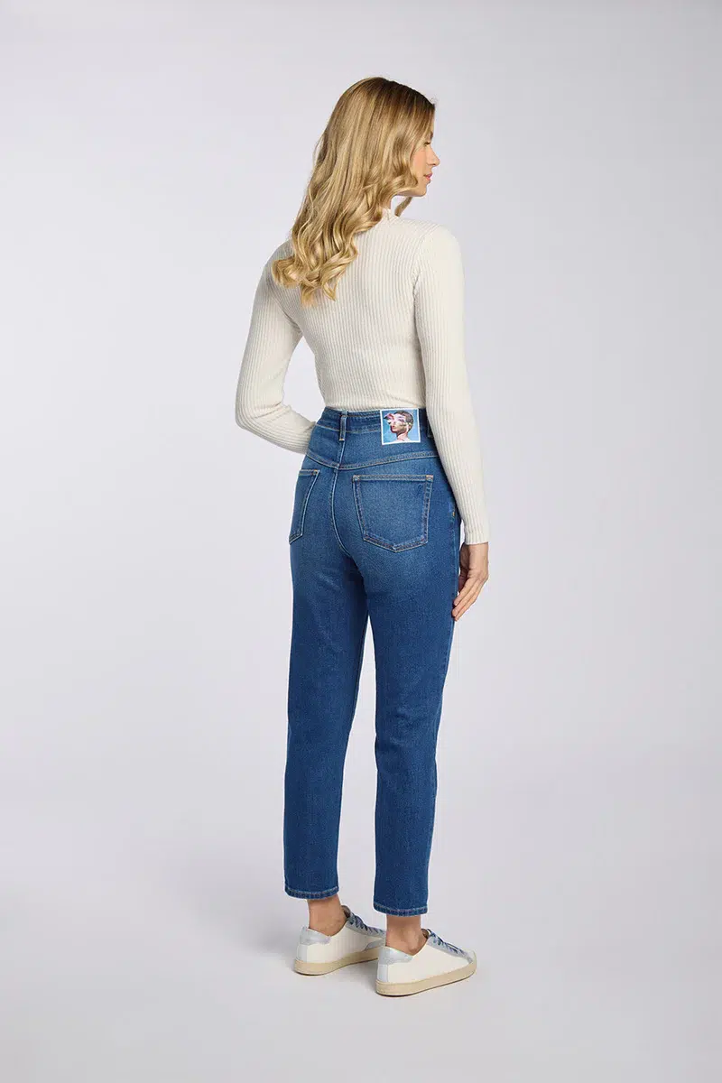 Goldgarn Jeans Q4 “Straight Mid Blue”. Diese Jeans besticht durch den tollen Bund im MOM-Fit und ist ein cooler Begleiter zu lässigen Statement Shirts, Blusen und Cardigans.