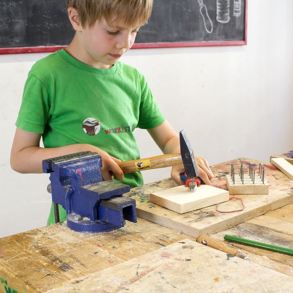 Dieser Hammer eine große Schlagfläche, so lassen sich Nägel leichter treffen. Mit kleineren Hämmern fehlt Kindern häufig die Kraft und die Präzission.