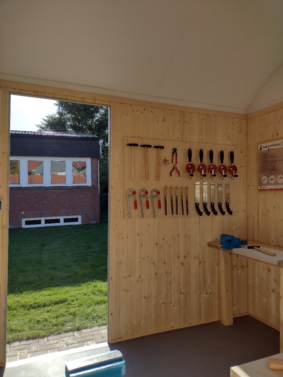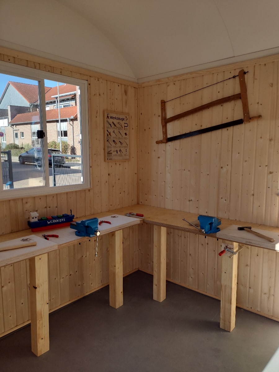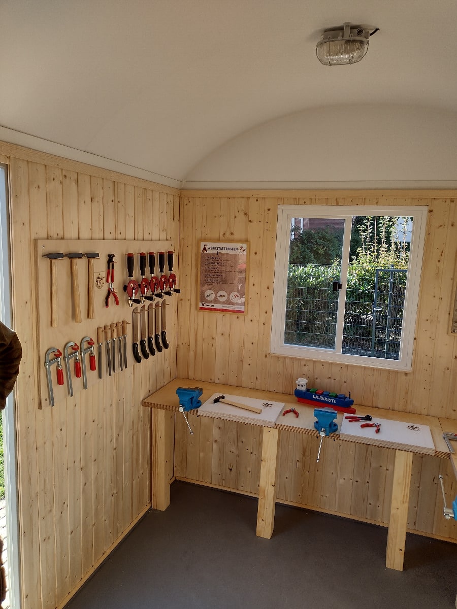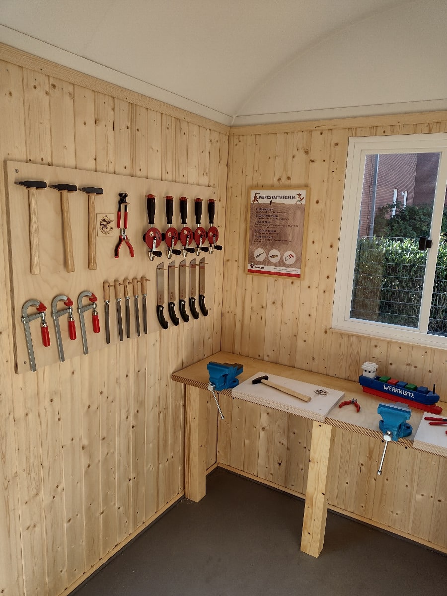 Fördert Kreativität und Geschick: Unsere Werkstatt unterstützt Kinder dabei, ihre motorischen Fähigkeiten weiterzuentwickeln, ihre Kreativität auszuleben und ihr technisches Verständnis zu verbessern – und das alles auf spielerische Weise. Ob für kleine Reparaturen oder kreative Bauprojekte, in dieser Werkstatt sind dem Tatendrang keine Grenzen gesetzt.