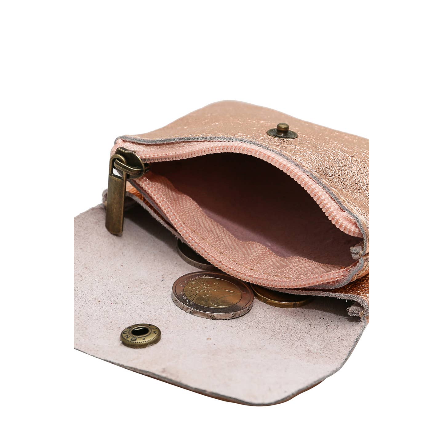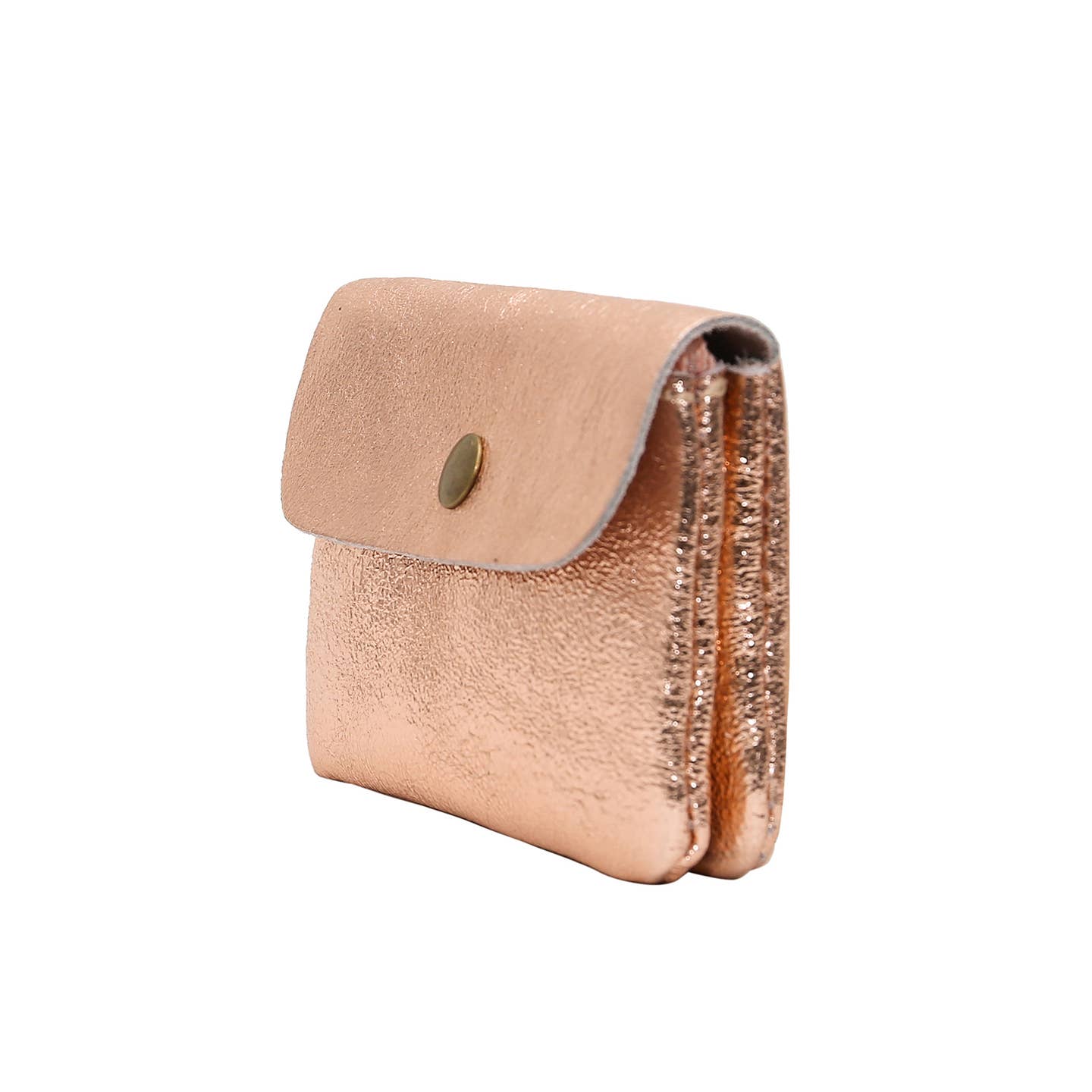 Geldbörse mit Druckknopfklappe aus metallischem Rindsleder. Zwei Fächer, eines davon mit Reißverschluss. Abmessungen: 11x9x2 cm