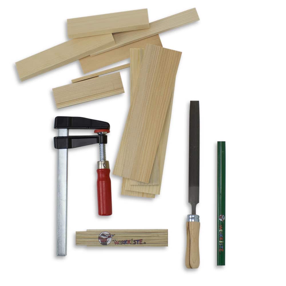 Die Kleiner Tischlerin Sets sind modular aufgebaut, sodass jedes Set individuell genutzt werden kann. Gleichzeitig lassen sich die Sets sinnvoll ergänzen, um noch mehr kreative Möglichkeiten zu eröffnen. Das Set 3 enthält alles, was Kinder für ihre ersten Schritte im Holzbau benötigen.