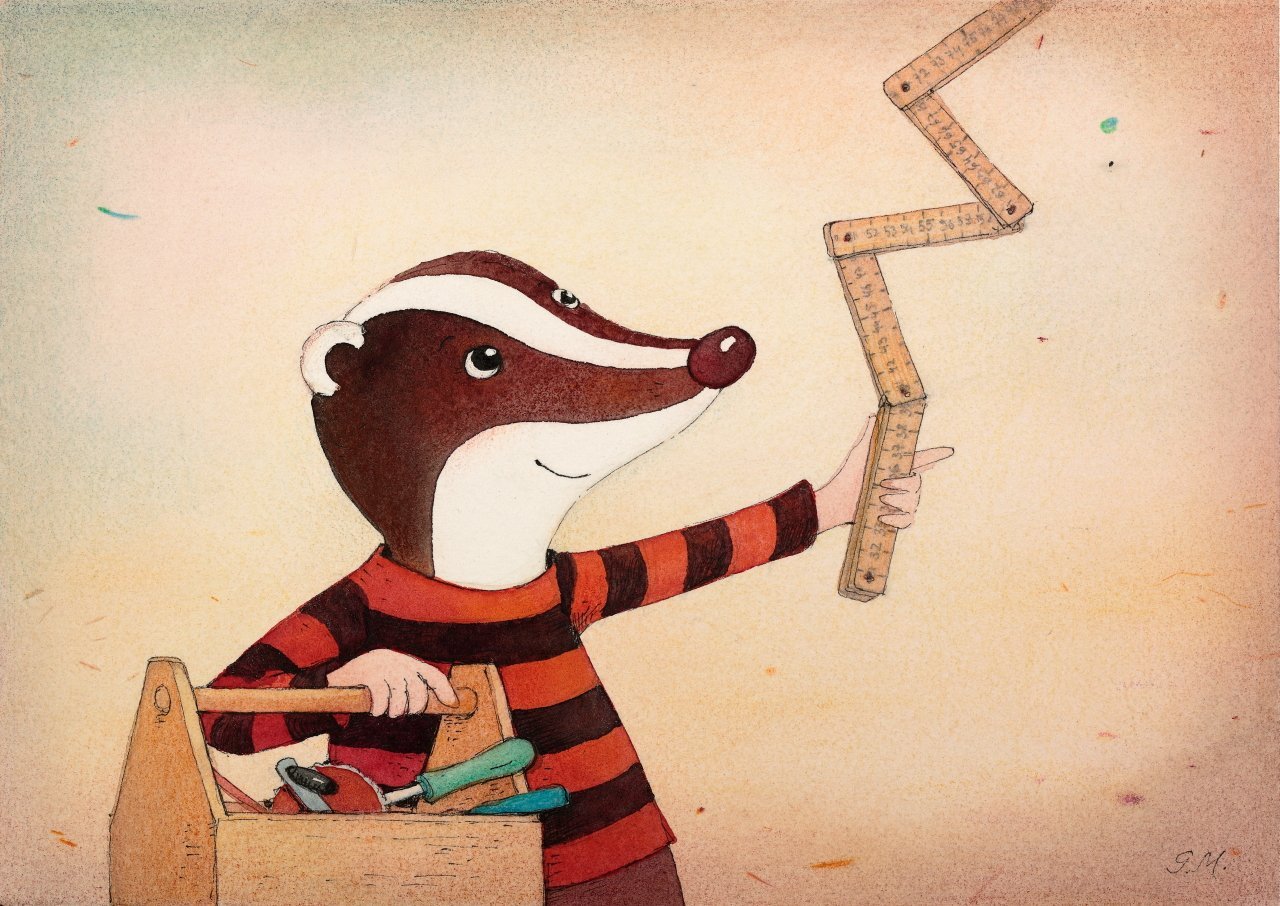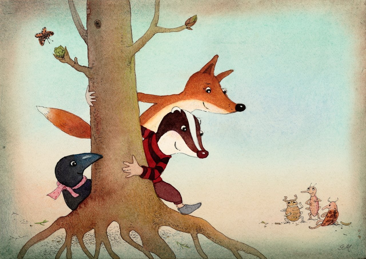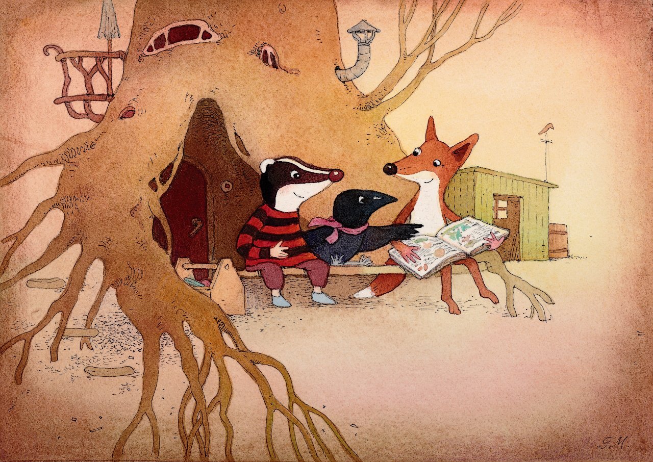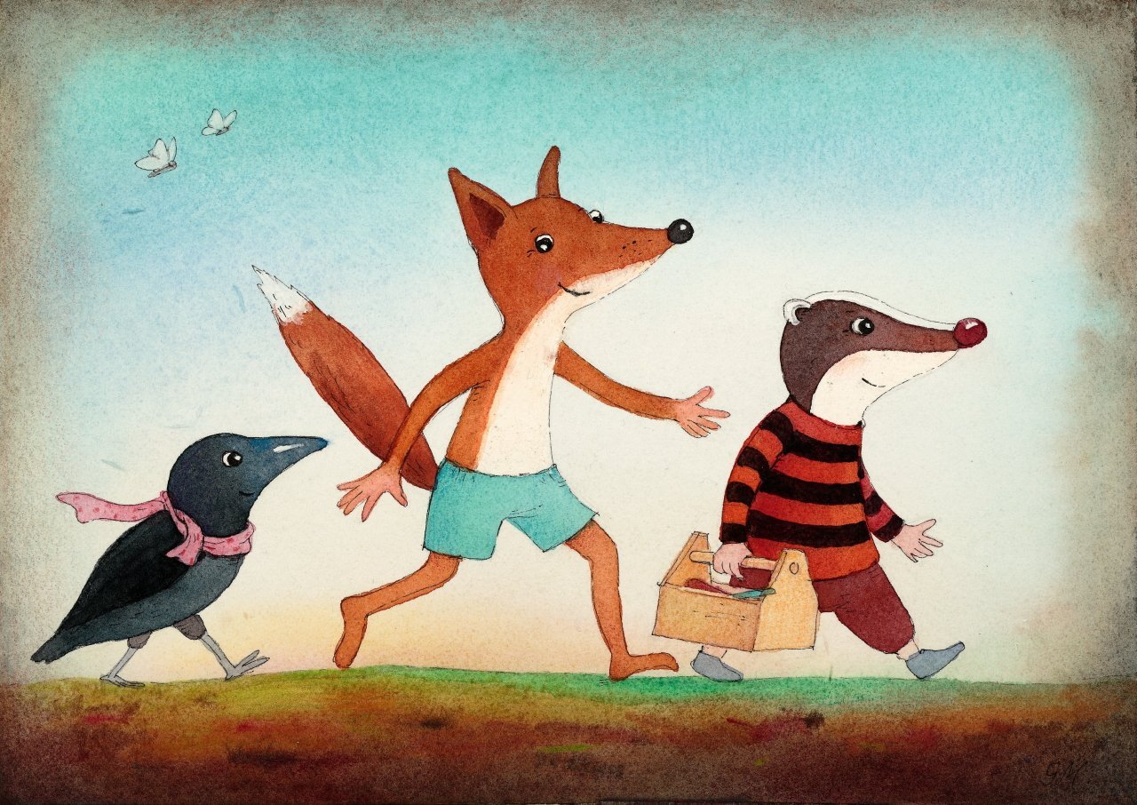 Unterschiedliche Motive mit Werkdachs, Fuchs und Krähe aus unserem Buch „Der Werkdachs und seine Freunde“.