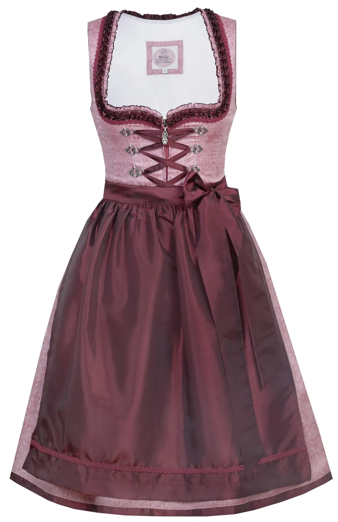 Sommerliches Kurzdirndl in Rocklänge 60cm. Die Verschnürung und der romantische Herzausschnitt passen perfekt und lassen jede Trägerin erstrahlen. Der leicht strukturierte seidig anmutende Stoff zieht sich durch das gesamte Modell harmoniert stilsicher mit der dunkelroten Schürze.