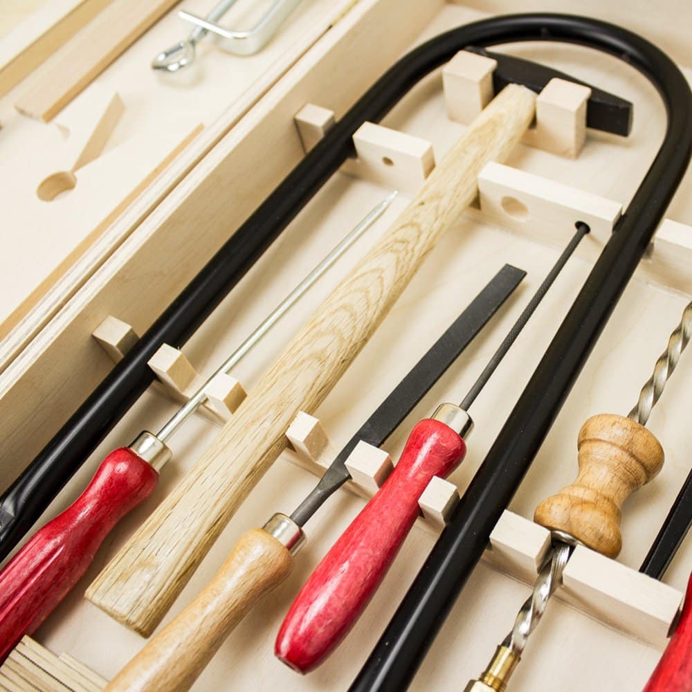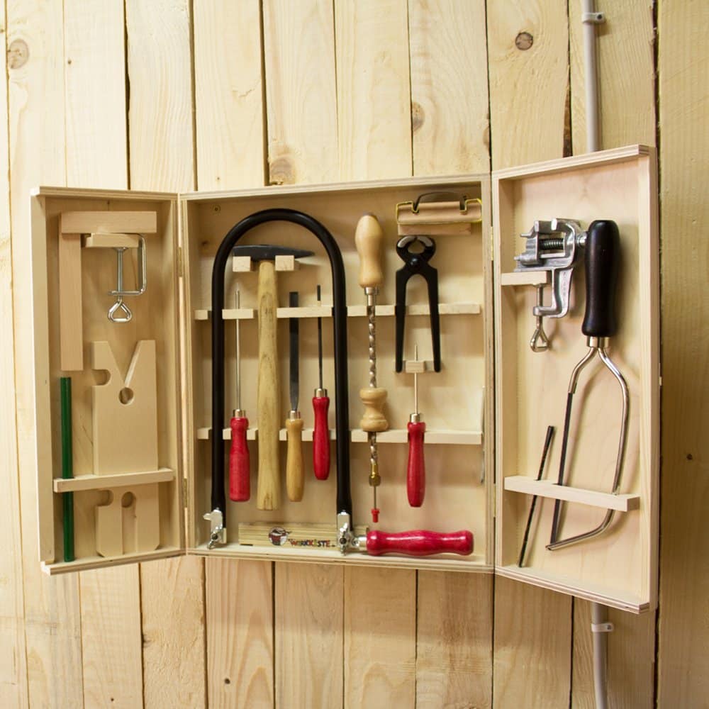 Der Laubsägeschrank beinhaltet alle wichtigen Werkzeuge für Laubsägearbeiten und noch einiges mehr. Mit dieser Werkzeugzusammenstellung lassen sich schon richtige kleine Werkstücke bauen. Genau das Richtige für die ambitionierten kleinen Laubsägekünstler*innen.