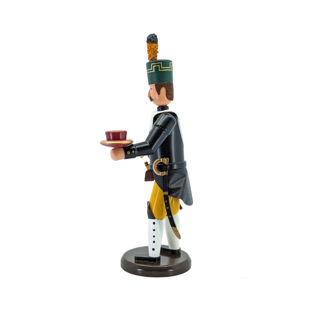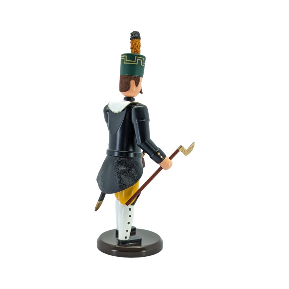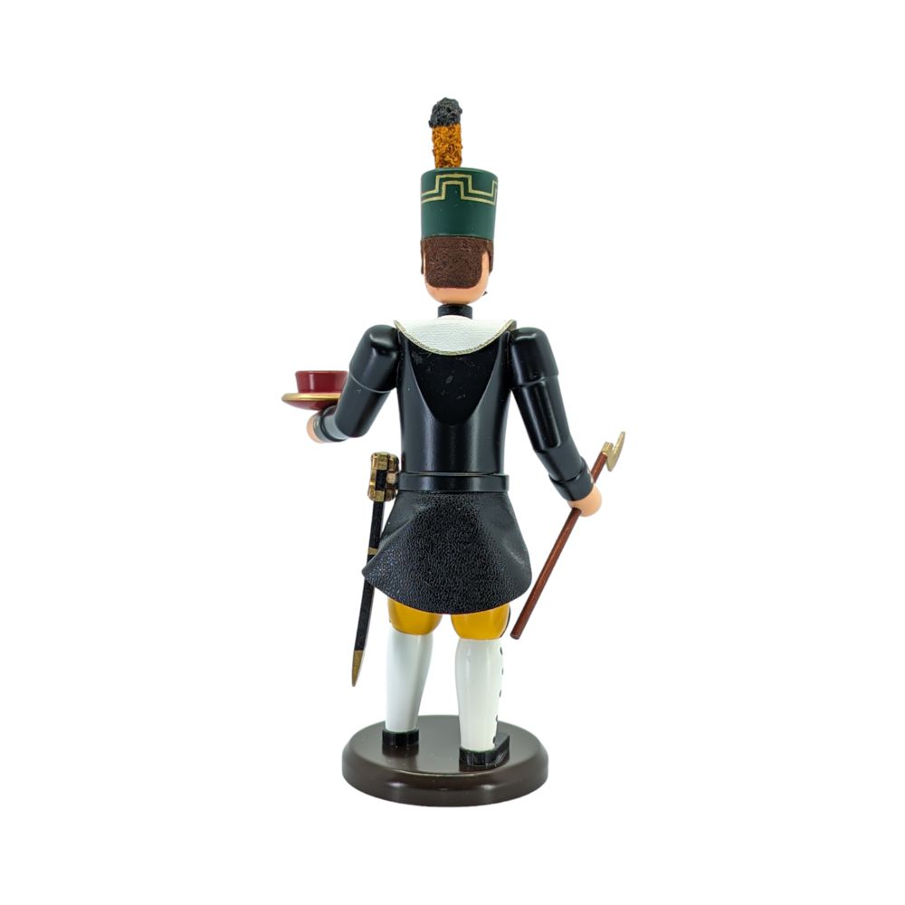 Der Lichterbergmann Steiger aus dem Hause Peter Ulbricht zählt neben dem Lichterengel zu den bedeutendsten Figuren des Erzgebirges. In traditioneller Schneeberger Tracht gehüllt, präsentiert er sich mit einer Jacke, deren goldene Knöpfe glänzend hervorstechen sowie ein Gefühl von Noblesse verleihen. An seiner Gürteltasche prangt stolz das Wappen der Bergmänner, ein Symbol für ihre Zunft und Tradition. Sein Gesicht strahlt Ausdruckskraft aus, geprägt von einer markanten Nase, braunen Augen, sowie einem imposanten schwarzen Schnauzbart, der sein Antlitz charakterisiert. Auf seinem Haupt thront eine Mütze, kunstvoll verziert und Zeugnis handwerklicher Meisterschaft.