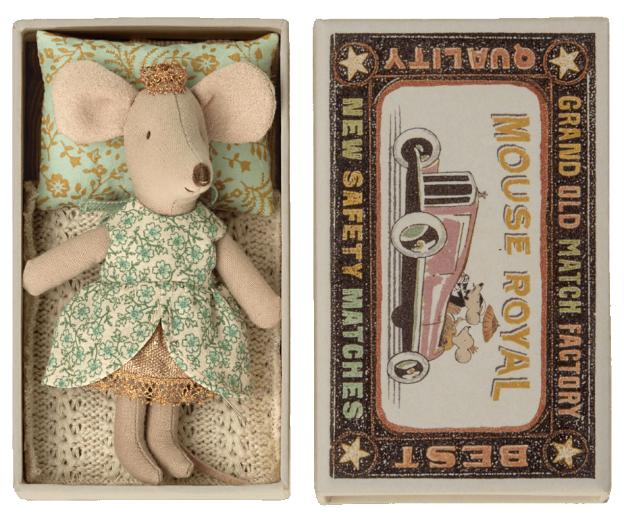 Die niedliche Prinzessin mit kleiner goldfarbener Krone liegt auf einer wunderbar weichen und königlich gestalteten Bettwäsche. Sie hat einen freundlichen Gesichtsausdruck und ruht auf einer fein gearbeiteten Decke mit Flechtmuster. Zufrieden schlummert sie in ihrem kleinen Schachtelbettchen.