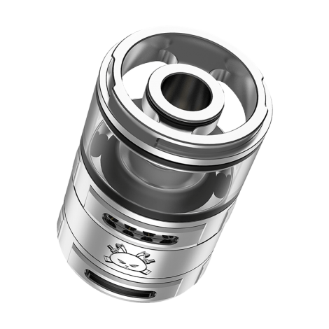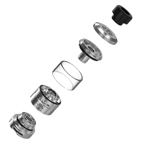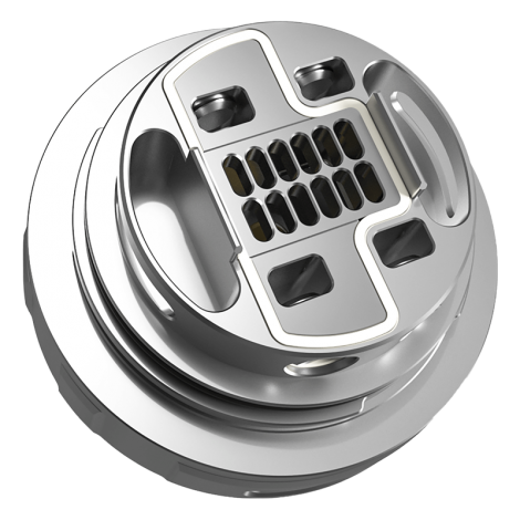 Gekrönt wird der Verdampfer von einem 810er Mundstück, welches aufgrund der inneren Struktur, die Bildung von Kondensat verhindert. Direkt darunter befindet sich die Top-Cap. Diese lässt sich dank ihrer fühlbaren Riffelung, perfekt greifen. Mittels einer 90°-Drehung öffnest du den Bajonettverschluss und gelangst so zu den zwei großzügig gestalteten Befüllöffnungen, über die du den 5,5 ml großen Tank bequem auffüllen kannst.