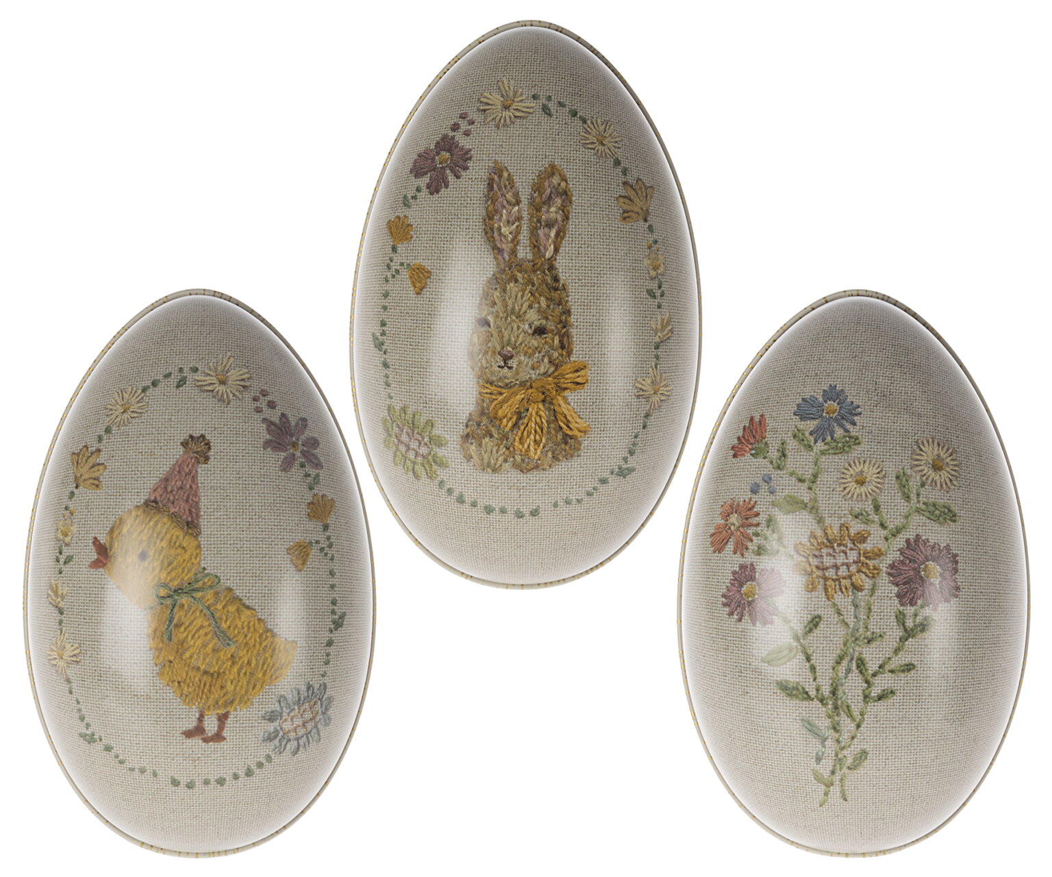 Was gibt es Schöneres als das Osterfest mit zauberhafter Dekoration zu feiern? Dieser drei niedlichen Deko-Eier sorgen für Osterfreude in Ihren vier Wänden. Der Print auf dem Ei ist ein Abgleich von Dorthe Mailils persönlicher Stickerei, die zu einem wunderschönen Druck auf den Eiern verarbeitet wurde.