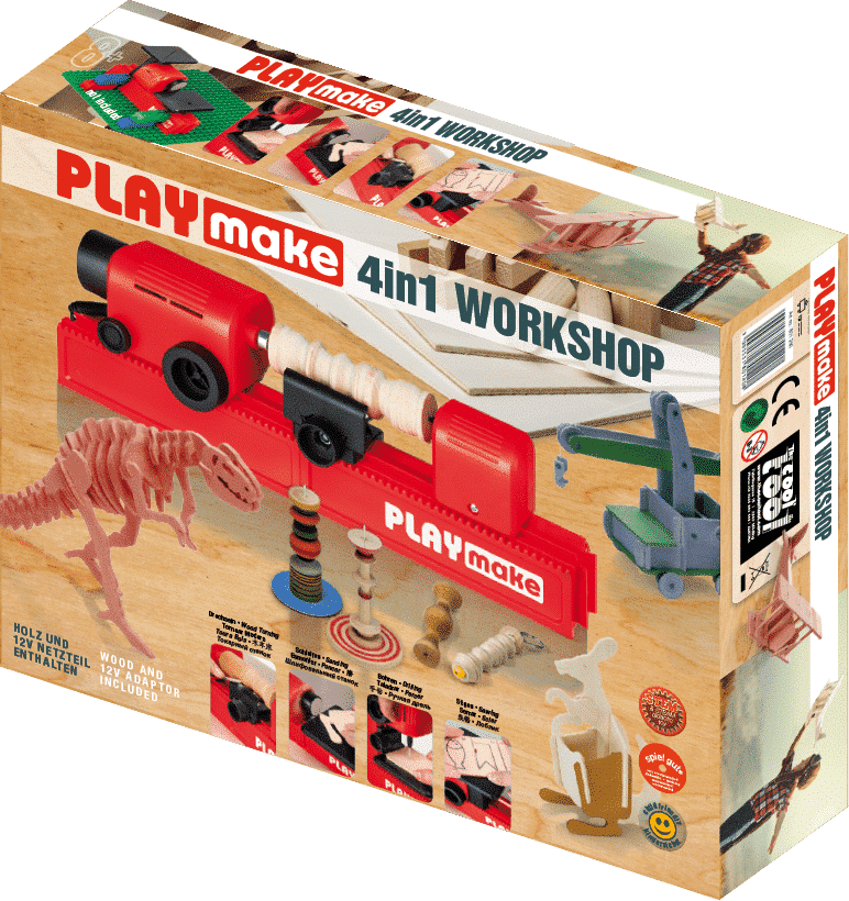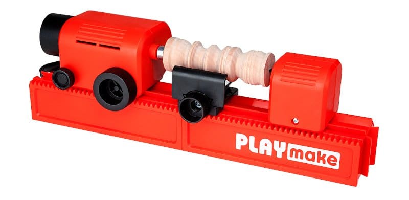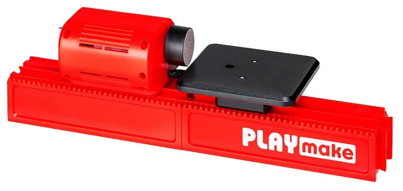 Die Playmake ist eine kleine Maschine, die sich mit wenigen Handgriffen von einer kleinen Tischbohrmaschine zur Tisch-Stichsäge und zur Drehbank umbauen lässt. Mit dabei ist außerdem ein kleiner Tischschleifer.