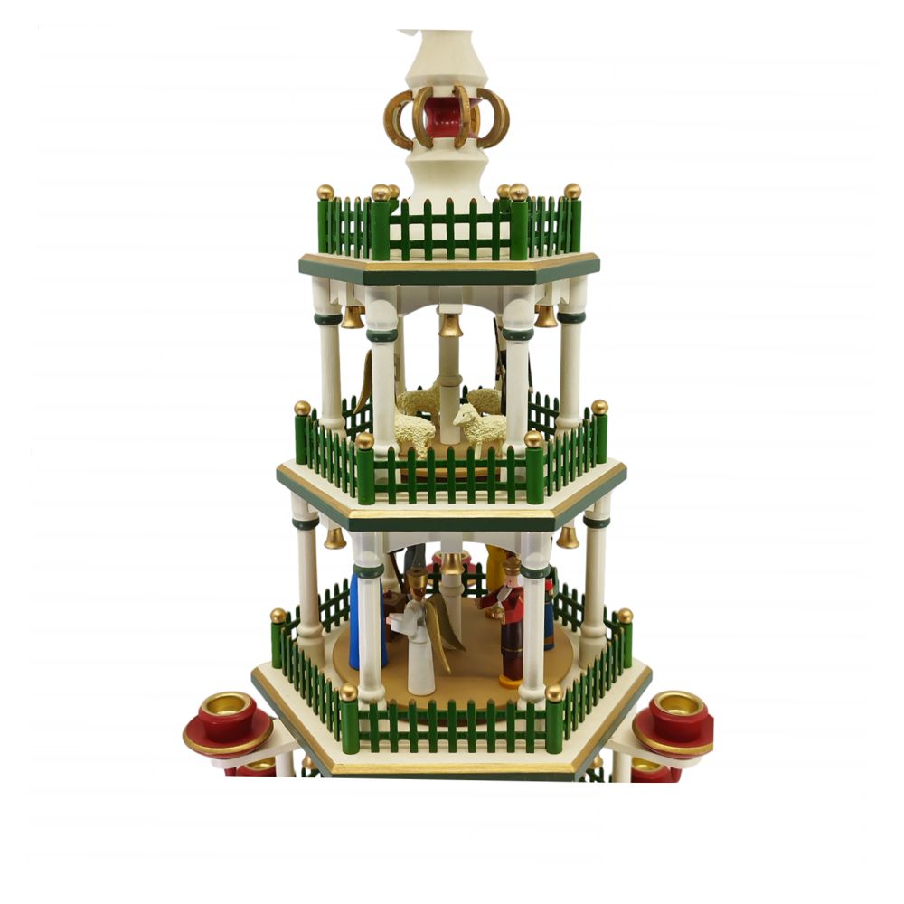 Auf der dritten Ebene zieht ein Schäfer samt seiner Herde umher, begleitet von einem weiteren schützenden Engel. Alle Figuren sind detailreich und in lebendigen Farben von Hand bemalt. Die Flügel der Pyramide strahlen in kräftigem Weiß und sind mit goldenen Sternen geschmückt.