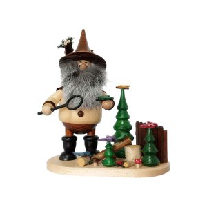Die Räucherpyramide “Förster mit Baummauser” ist ein handgefertigtes Kunstwerk, das ganz in natürlichen Holzfarben gehalten ist. Diese besondere Räucherpyramide zeichnet sich durch eine abnehmbare Jagdhütte im Mittelpunkt aus, die mit Räucherkerzen bestückt werden kann. Hinter der Jagdhütte erhebt sich ein langer Schornstein in den Himmel, der die Achse der Pyramide im Inneren verbirgt. Oben aus dem Schornstein ragt ein Flügelblatt, das durch zwei Teelichter angetrieben wird. Die Kerzenhalter bestehen aus dunkelbraunem Holz.