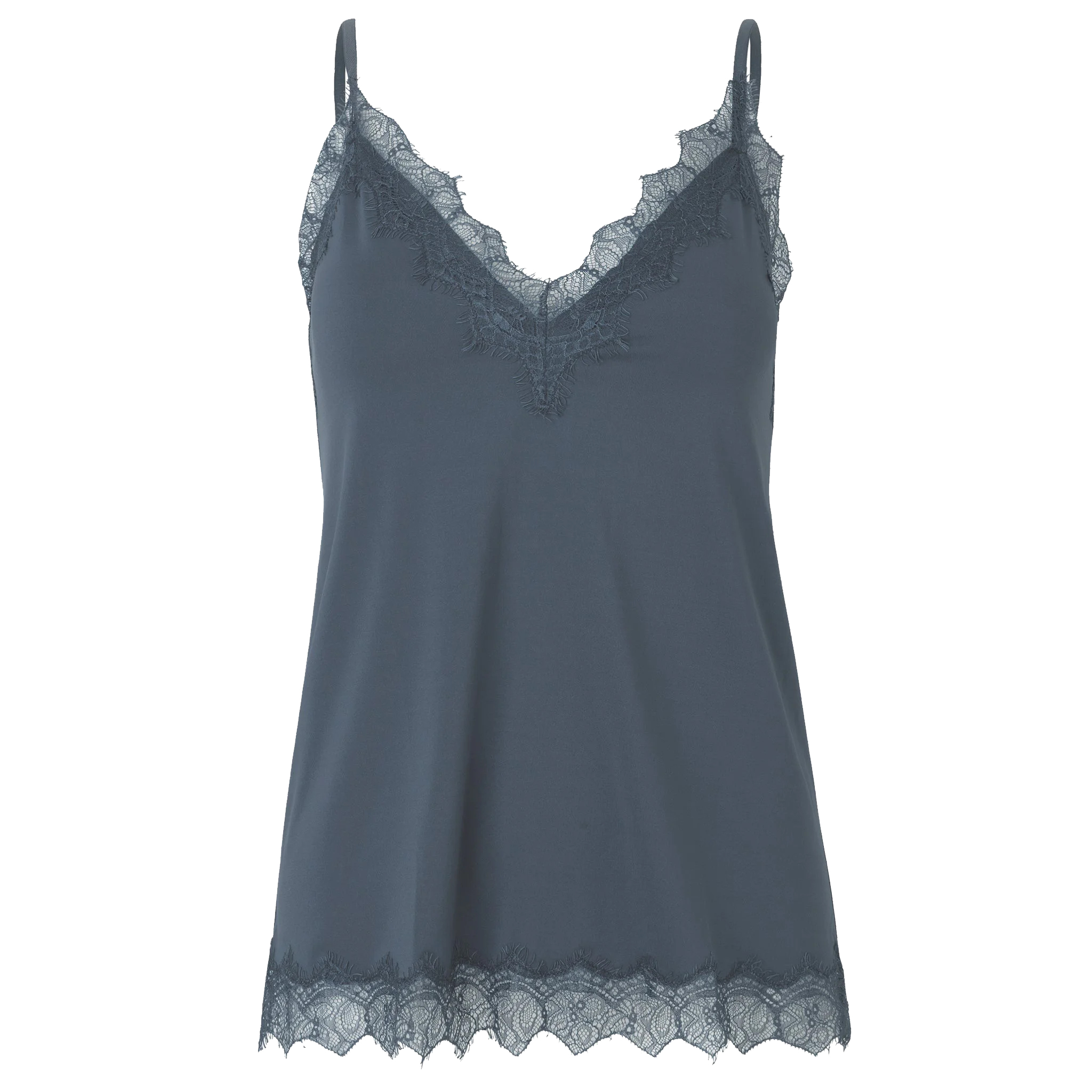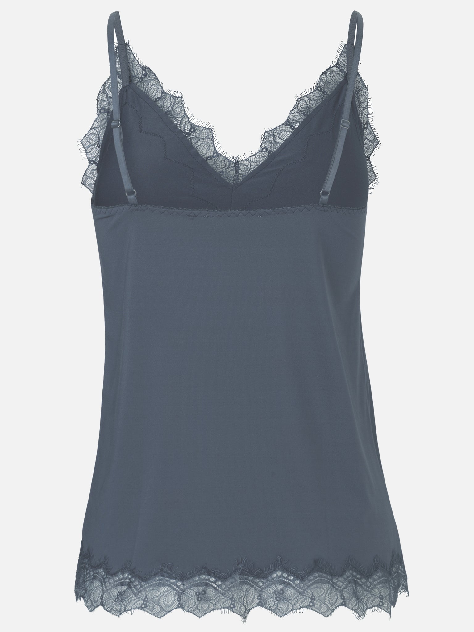 Rosemunde Spitzen Trägertop “Paris Blue”. Schönes Spitzen Top mit V-Ausschnitt und verstellbaren Trägern. Es ist mit einer atemberaubenden Spitze sowohl oben als auch unten entworfen. Tragen Sie es wie es ist, unter einer Bluse oder unter einem Blazer für einen stilvollen Look.