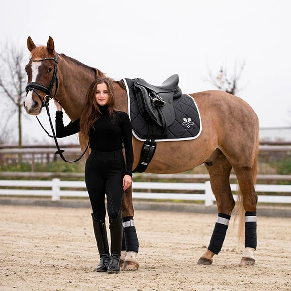 Anatomisch geformte Schabracke mit wunderschöner Sternensteppung. Gefüllt mit Schaumstoff und Volumenvlies für eine bessere Stoßabsorbation. Unterstoff aus 100% Baumwoll- Waffelpiqué, das den Schweiß schnell aufsaugt. Auf der linken Seite mit unserem Logo in Silber bestickt.