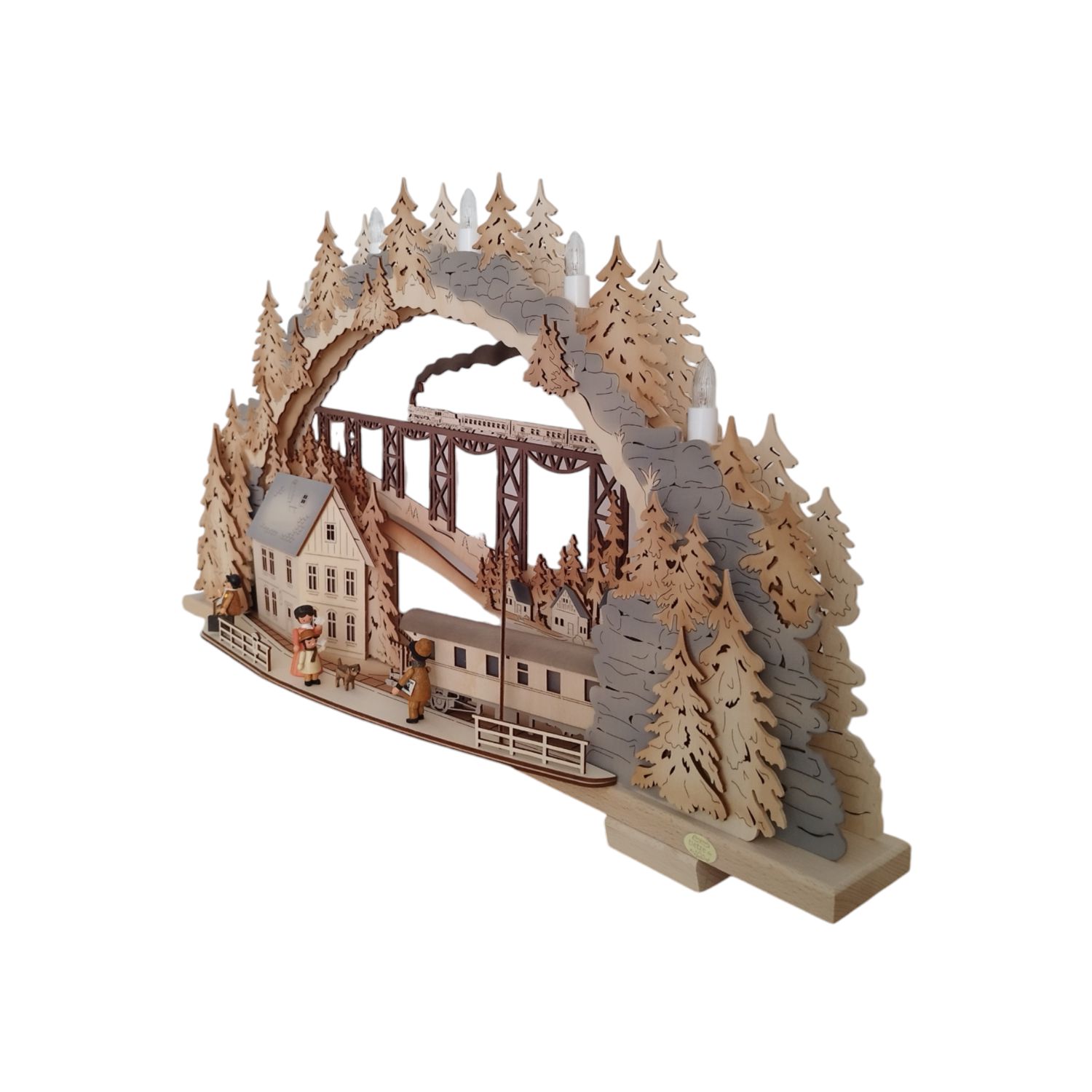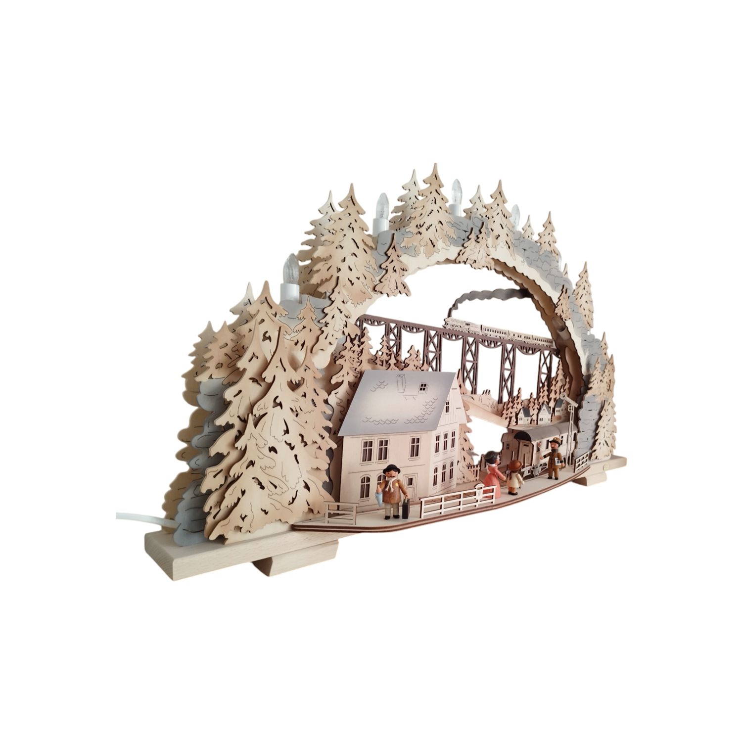 Der vielseitige Schwibbogen Zugfahrt ins Erzgebirge, variabel ist ein Meisterwerk aus 3 mm naturbelassenem Birkensperrholz. In aufwendiger Airbrushtechnik wurde der Bogen zusätzlich koloriert. Jede einzelne Figur ist in präziser Handwerkskunst detailgetreu gedrechselt, damit wird die außergewöhnliche Qualität dieses Schwibbogens unterstrichen.