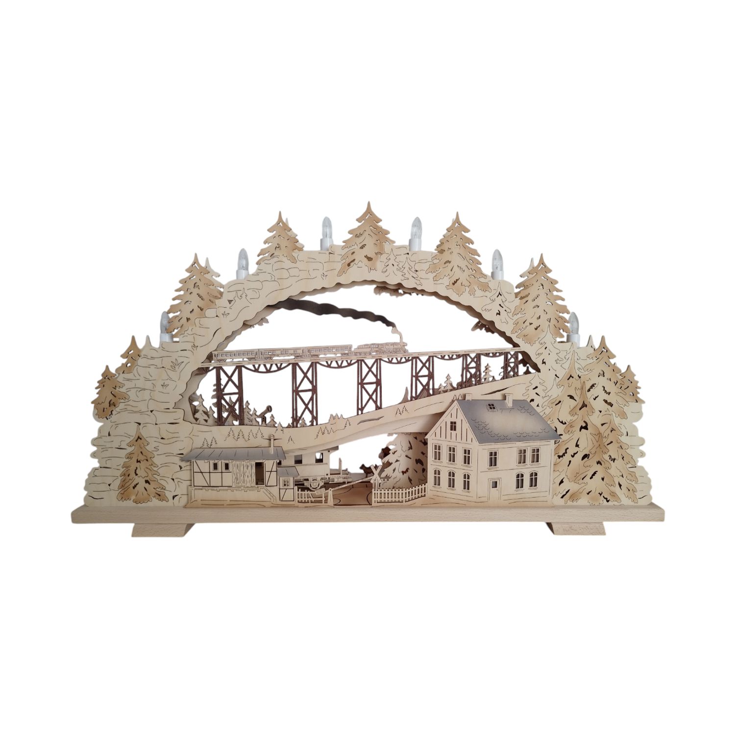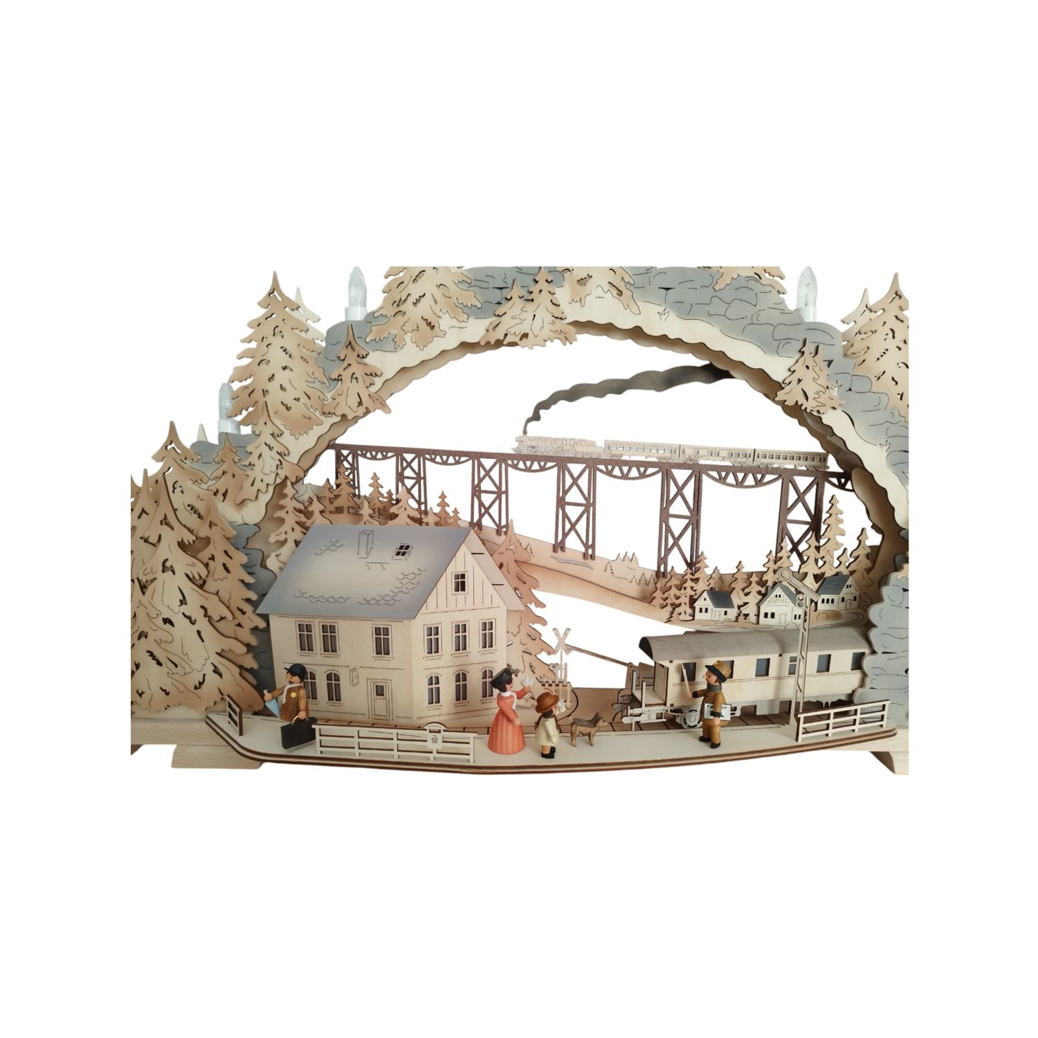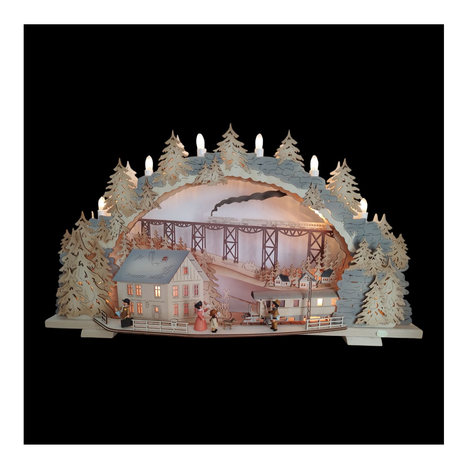 Mit einer Größe von 72 x 41 x 7 cm bietet dieser flexible Schwibbogen die Möglichkeit, dank der einzelnen Steckelemente individuelle Gestaltungswünsche umzusetzen. Jedes Detail wurde in filigraner Kleinarbeit sorgfältig ausgearbeitet. Angefangen von den charmanten Figuren am Bahnhof bis hin zur detailgetreuen Darstellung der Eisenbahnbrücke mit einem Zug in der Ferne. Dieser Schwibbogen besticht durch seine Liebe zum Detail und bietet somit bei jedem Betrachten die Möglichkeit, neue kleine Besonderheiten zu entdecken.