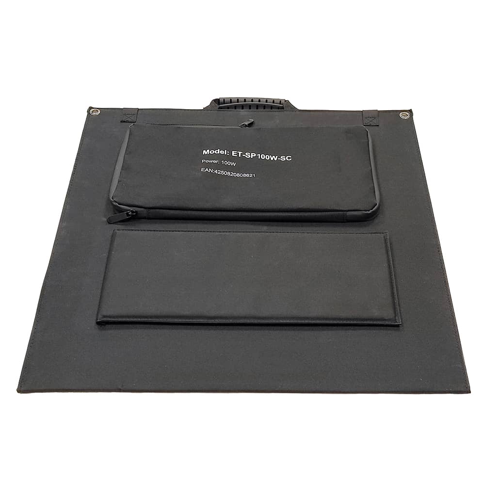 Das Solar Panel kann für den Transport platzsparend eingefaltet und an den praktischen Trageschlaufen bequem mitgenommen werden. Auf der Rückseite befindet sich eine Tasche mit Reißverschluss, in der die mitgelieferten Ladekabel untergebracht sind. Wenn das Solar Panel aufgestellt wird, sorgen ausklappbare Stützen für eine optimale schräge Ausrichtung zur Sonne. Das Nylonmaterial ist wasserabweisend.