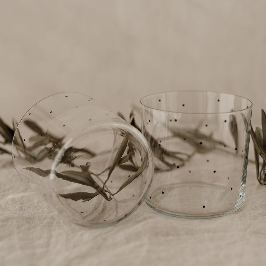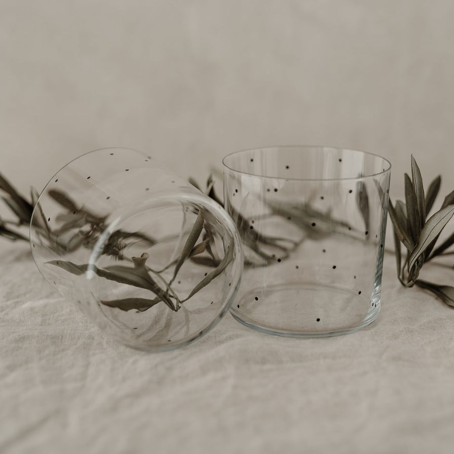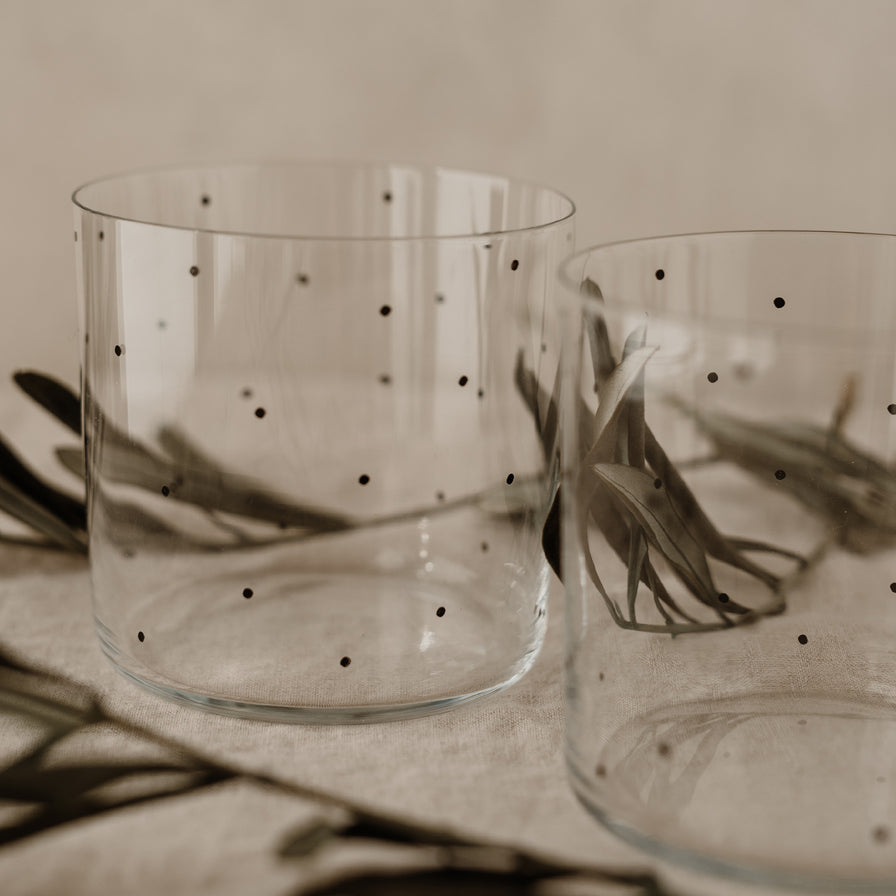 Entdecke zwei wundervolle zylindrische Trinkgläser mit schwarzem Druck an der Glaswand und einer schlichten Eulenschnitt Gravur im Boden. Diese neuen Trinkgläser sind sehr dünnwandig und dadurch super leicht und dennoch extrem stabil, sowie stapelbar. Genau das macht sie in Verbindung mit dem minimalistischen Design so besonders. Beide Gläser zieren ein Punke Allover Design. Einfach ein ganz besonderer Hingucker in deiner Küche – ob als Wasserglas, Cocktailglas, Dessertglas oder aber auch zum Anrichten von Früchten, Snacks oder Müsli! Diese Gläser sind vielfältig einsetzbar!