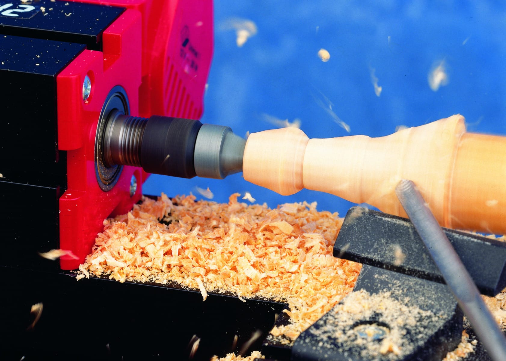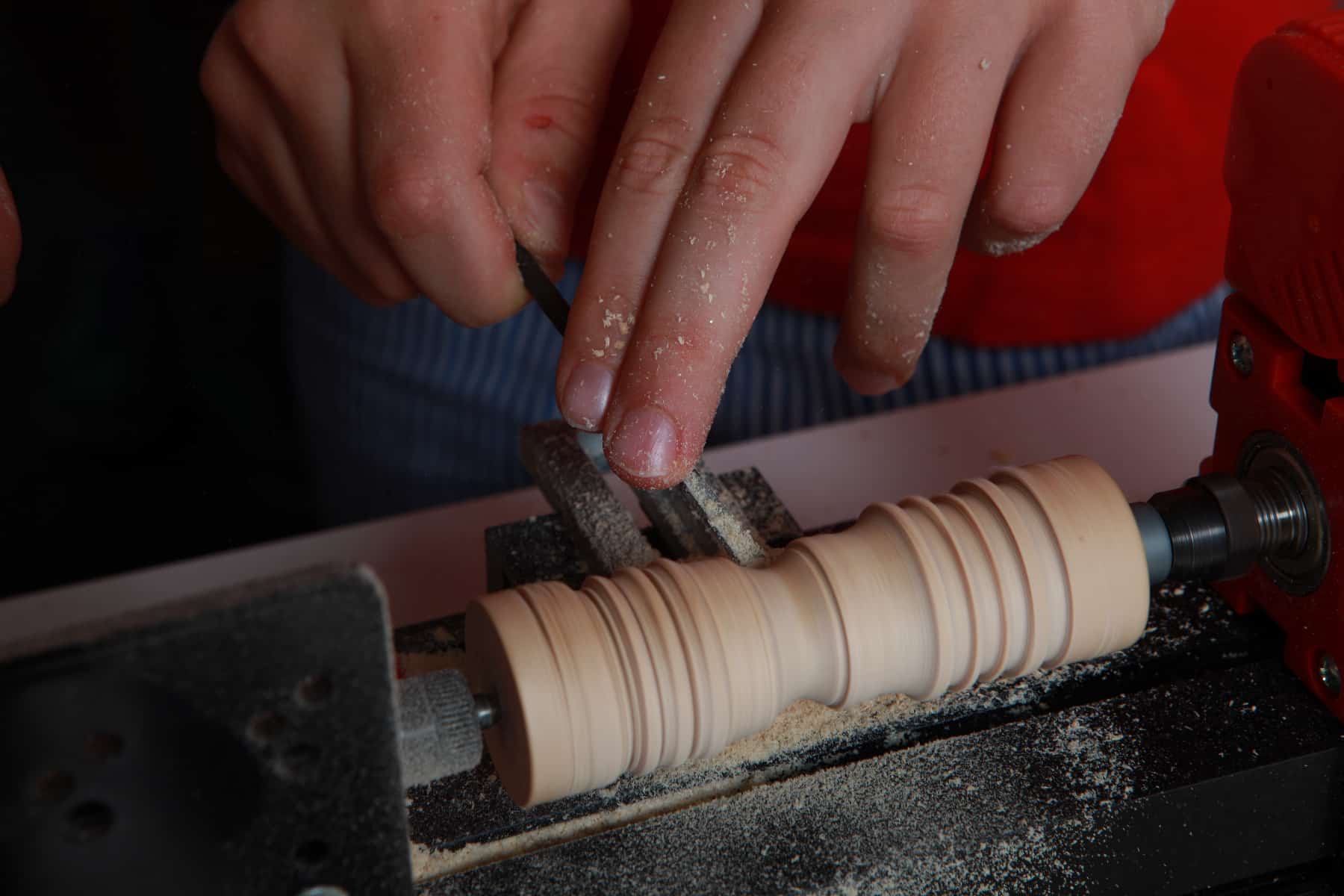 Die kleine Drechselbank ist dank des 12 V Motors stark und doch kindersicher. Es lassen sich tolle Dinge wie Kerzenständer, Möbelfüße, Spielfiguren, etc. herstellen. Das Werkstück kann längs eingeklemmt oder bei der Herstellung kleiner Schüsseln (Eierbecher) auch mittels der Planscheibe eingespannt werden.