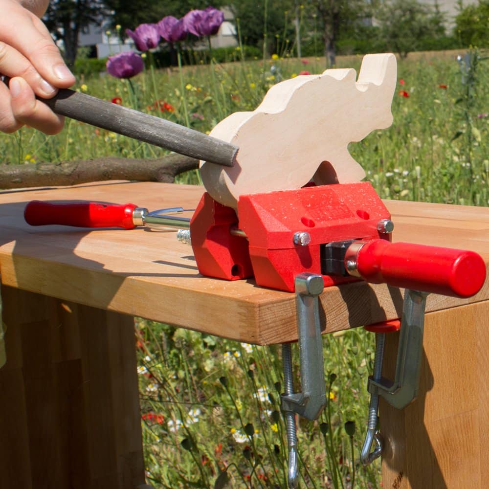 Die Klemmfunktion ersetzt einen Schraubstock oder eine Vorderzange. Ideal zum Mitnehmen für Ausflüge oder zum Werken im Garten. An der Werkbank ist auch eine seitliche Montage möglich. So lassen sich Werkstücke praktisch überall sicher befestigen.