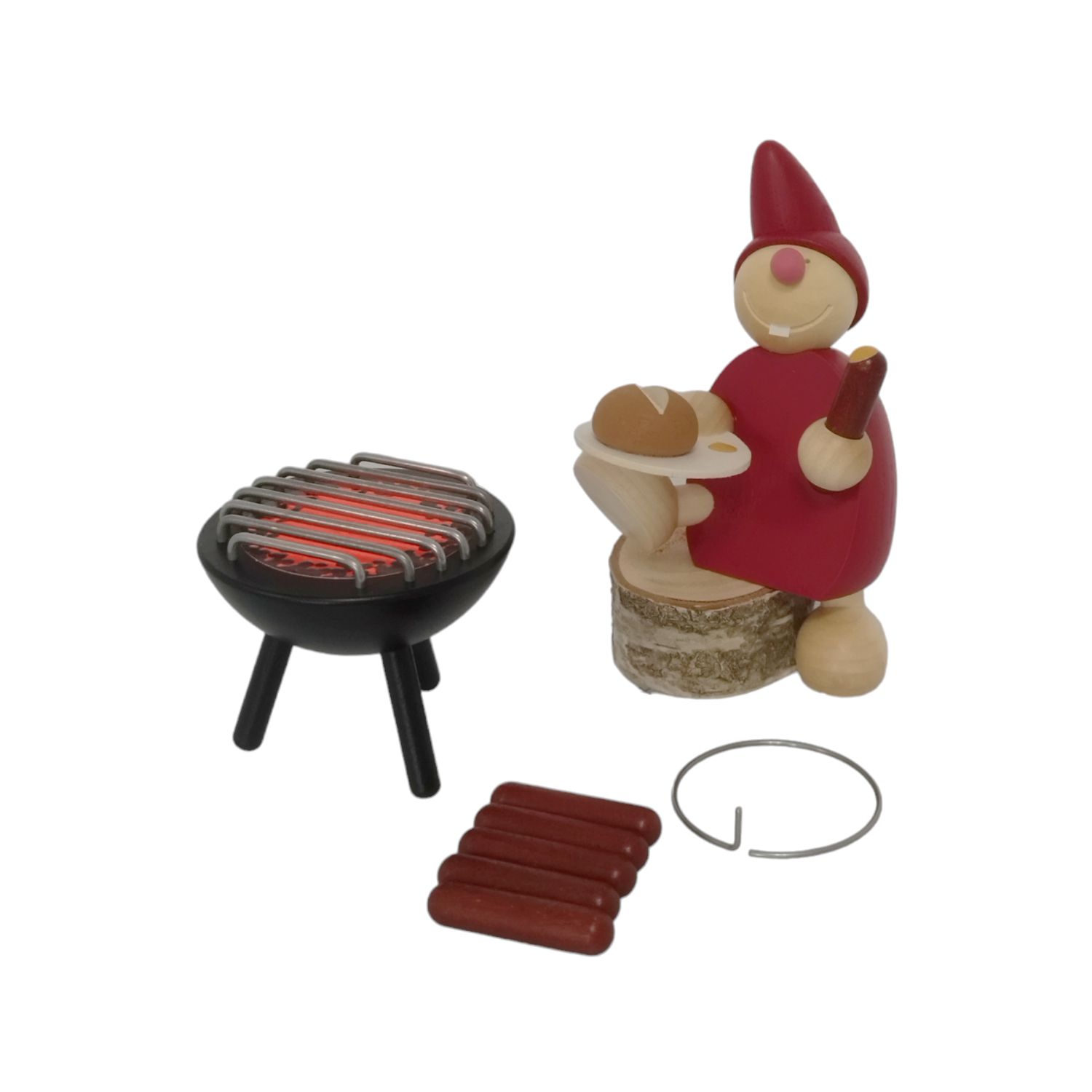 Das gesamte Setting vermittelt eine gemütliche und einladende Grillatmosphäre, die den Wicht als erfahrenen und leidenschaftlichen Grillmeister darstellt.