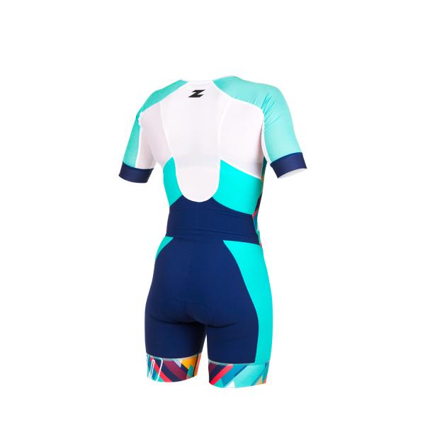 Dieser Hochleistungs- und Hochgeschwindigkeits-Trisuit wurde entwickelt, um die aerodynamische Effizienz deutlich zu verbessern und somit den Luftwiderstand zu reduzieren, der beim Rennen auftritt. Dieses Triathlon-Kleidungsstück hat kurze Ärmel, die bis zum Bizeps reichen und diesen Muskel für eine ideale Unterstützung vollständig bedecken. Im Vergleich zu nackter Haut bietet das Hinzufügen von Ärmeln zum Anzug eine viel bessere Aerodynamik, insbesondere bei Rennen in einer Zeitfahrposition auf dem Radabschnitt.