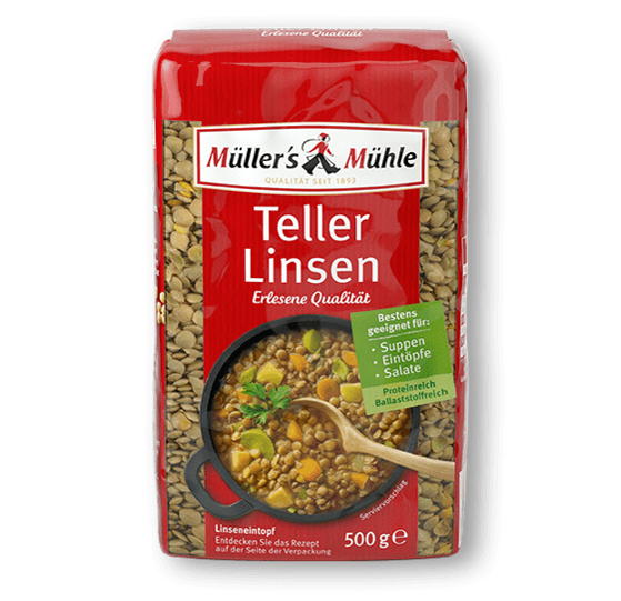 Teller Linsen sind die gebräuchlichsten Linsen mit ihrem zart-nussigen Geschmack. Sie sind ideal für Eintöpfe, Suppen und Salate verwendbar. Teller Linsen haben einen Durchmesser von 6 – 7 mm.